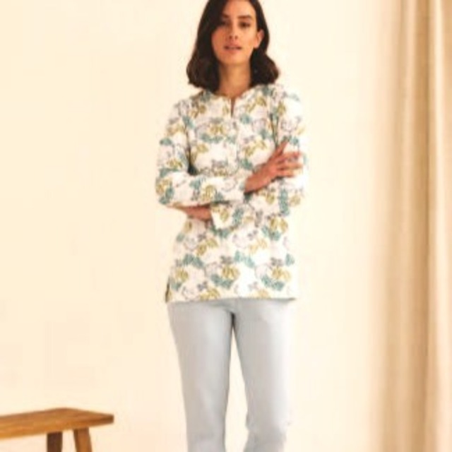 本体価格:29000円 デザイン:フランス 製造:インド 素材:コットン100% サイズ:2サイズ(国産Mサイズ目安) カラー:オリーブ/プリント フランス CANAT カナ newコレクション コットン長袖パジャマ。 ”CANAT”カナはフランス 設立は1920年MILLAU。 素材選びには注意して、高品質な生地、快適な着心地を重視しています。 フランスらしいエレガンスと洗練された仕上げ。 コットン100%天然素材、通気性に優れて体に優しい安心の素材です。 お肌への刺激が少ないので敏感肌の方にもお薦めです。 ジャージニット素材は伸縮性、柔らかさで着心地を快適なリラックス仕様に。 体への負担にならないよう軽い目に仕上げています。 ヒップを覆いかくす長めのトップスは冷え防止にお役立ち。 質の良いパジャマは質の良い睡眠をそして心も体もリラック。 自然の草花をプリントしたショールカラーの可愛いコレクション。 ※画面上と実物では多少色具合が異なる場合がございます事、ご了承ください