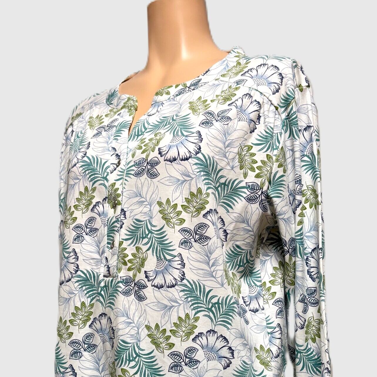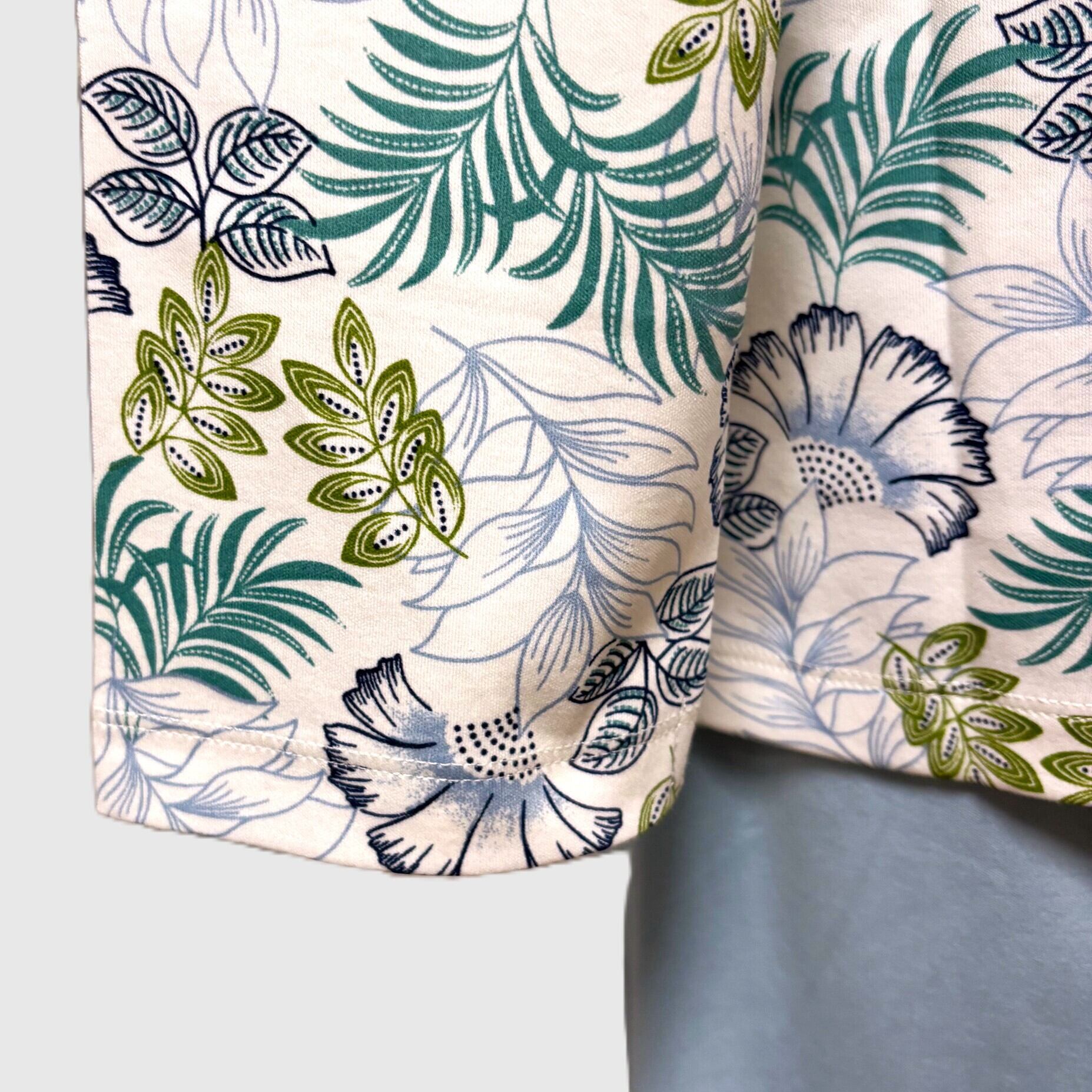 満開に咲き誇る自然の草花をプリント、Vネックしたに施されたシルバー